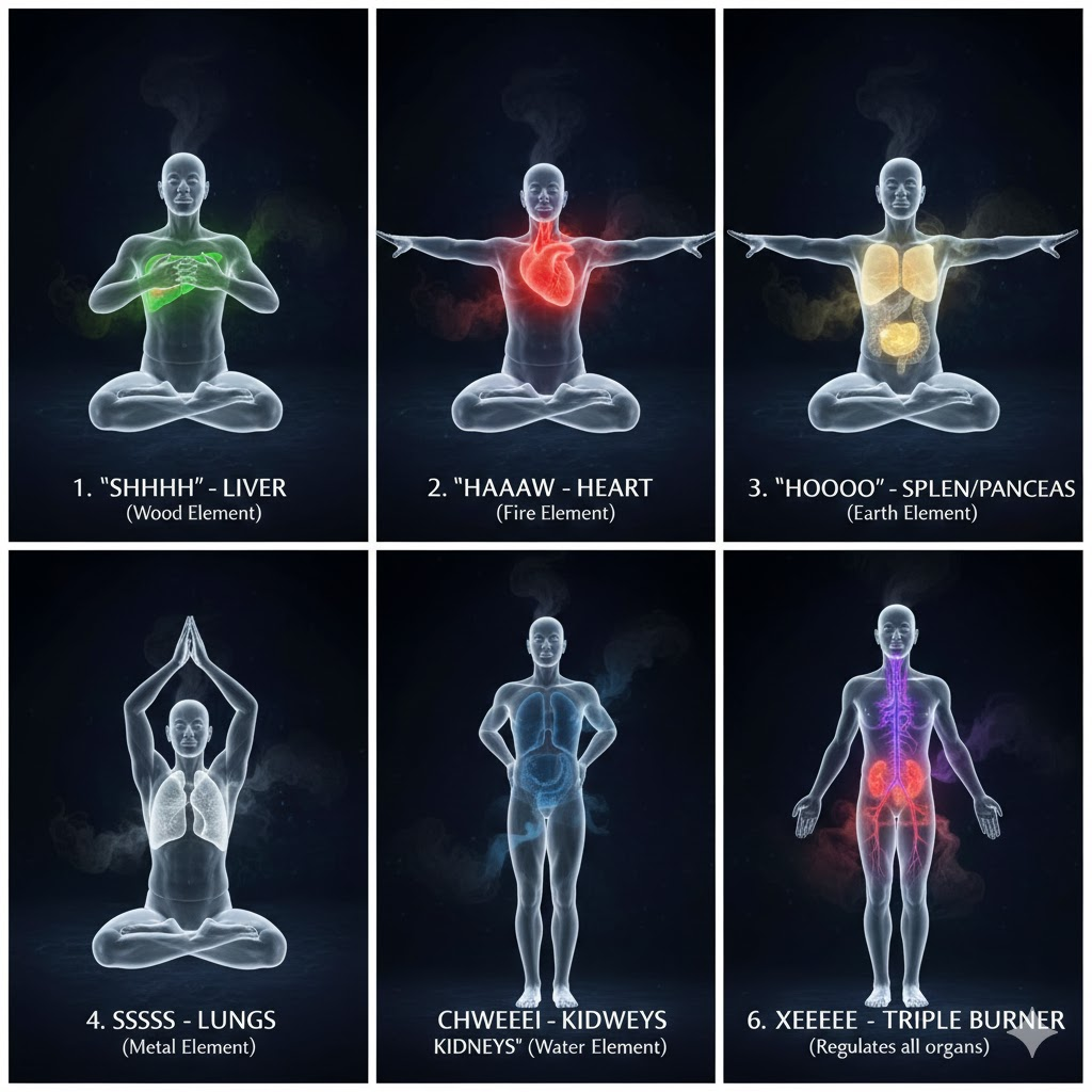 Before moving energy, we must transform it. The Inner Smile acts as an “antidote to stress,” drawing positive energy into the organs and glands. This is followed by the Six Healing Sounds, which utilize specific vibrations and postures to purge excess heat and toxins from the organs, preparing them for higher energy circulation.